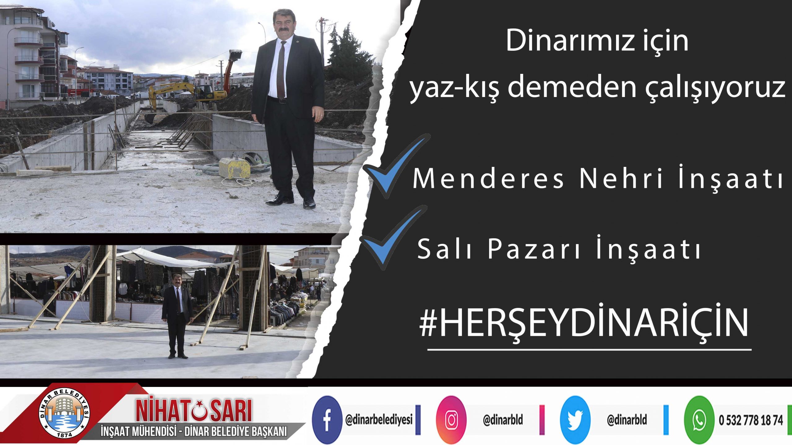 Dinar Belediye Başkanı Nihat Sarı, belediye tarafından yapımı devam eden çalışmaları yerinde inceledi. Çalışmalar kapsamında; Menderes Nehri Islahı inşaatında ve Salı Pazarı yerinde incelemelerde bulunarak Pazar esnafı ve vatandaş ile sohbet eden Belediye Başkanı Nihat Sarı, “İlçemizde yaz-kış demeden aralıksız bir şekilde çalışıyor, yapımı devam eden projelerimizin çalışmalarını yakından takip ediyoruz. İlçemizin kanayan yarası olan Menderes Nehrimizin ıslah projesi hızlı bir şekilde devam ederken, Salı Pazarımızda yapımına başlanan inşaatın çalışmaları da devam ediyor. Dinarımıza en iyi şekilde hizmet vermek adına yaz-kış demeden çalışıyoruz.” dedi.