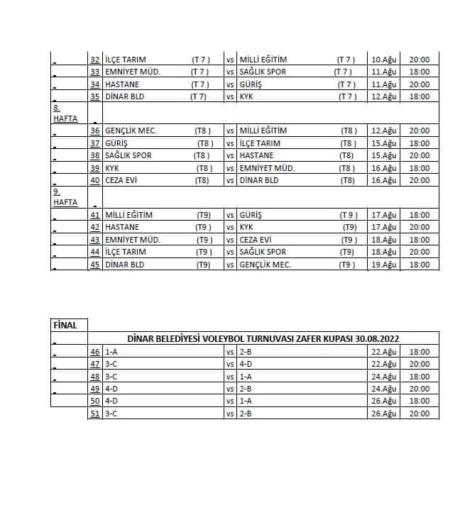 10 takımın yarışacağı turnuvanın çekilişi öncesi bir konuşma yapan Dinar Belediye Başkanımız Nihat Sarı, “Dinar Belediyesi olarak bu yıl 2.sini düzenlediğimiz Geleneksel Kurumlar arası Voleybol Turnuvası’nın kura çekimini gerçekleştiriyoruz. Yapacak olduğumuz bu turnuva ile kurumlar arası iş birliği ve kaynaşmayı daha da arttırmayı hedefliyoruz. Ayrıca gençlerimize ve çocuklarımıza da sporu sevdirmeyi amaçlıyoruz. Şimdiden kura sonucunda karşılaşacak olan takımlarımıza başarılar diliyor, tüm sporsever halkımızı maçlarımızı izlemeye davet ediyorum.” dedi. Lig usulü gerçekleşecek olan turnuvanın maç fikstürleri aşağıda yer almaktadır.